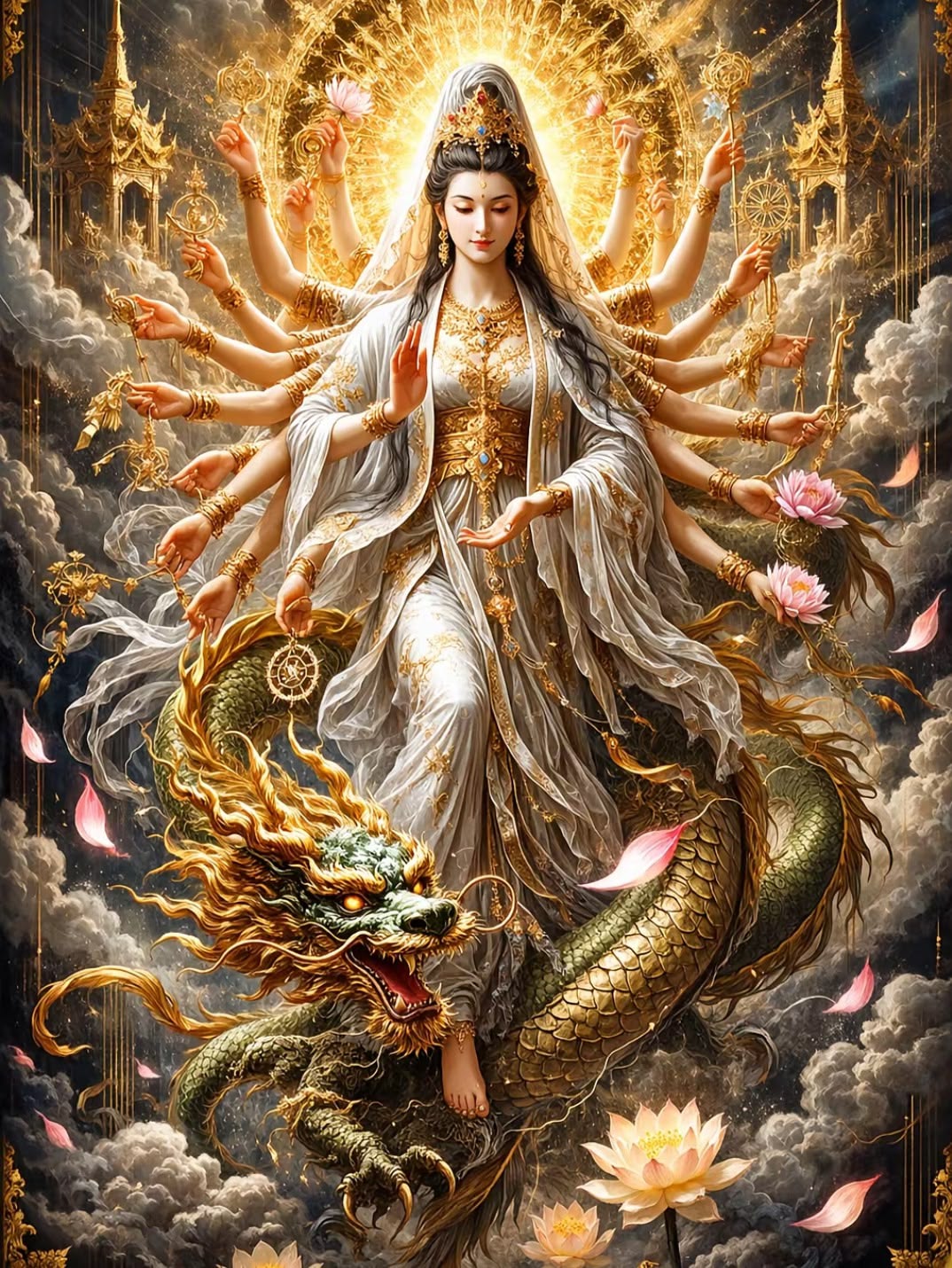 Гуань-Инь родилась от богини и демона, что обуславливает её двоякую и неоднозначную природу: она - выступающее преимущественно в женском обличие божество, покровительница женской половины дома, дарующая детей, родовспомогательница, а также спасительница от неприятностей.