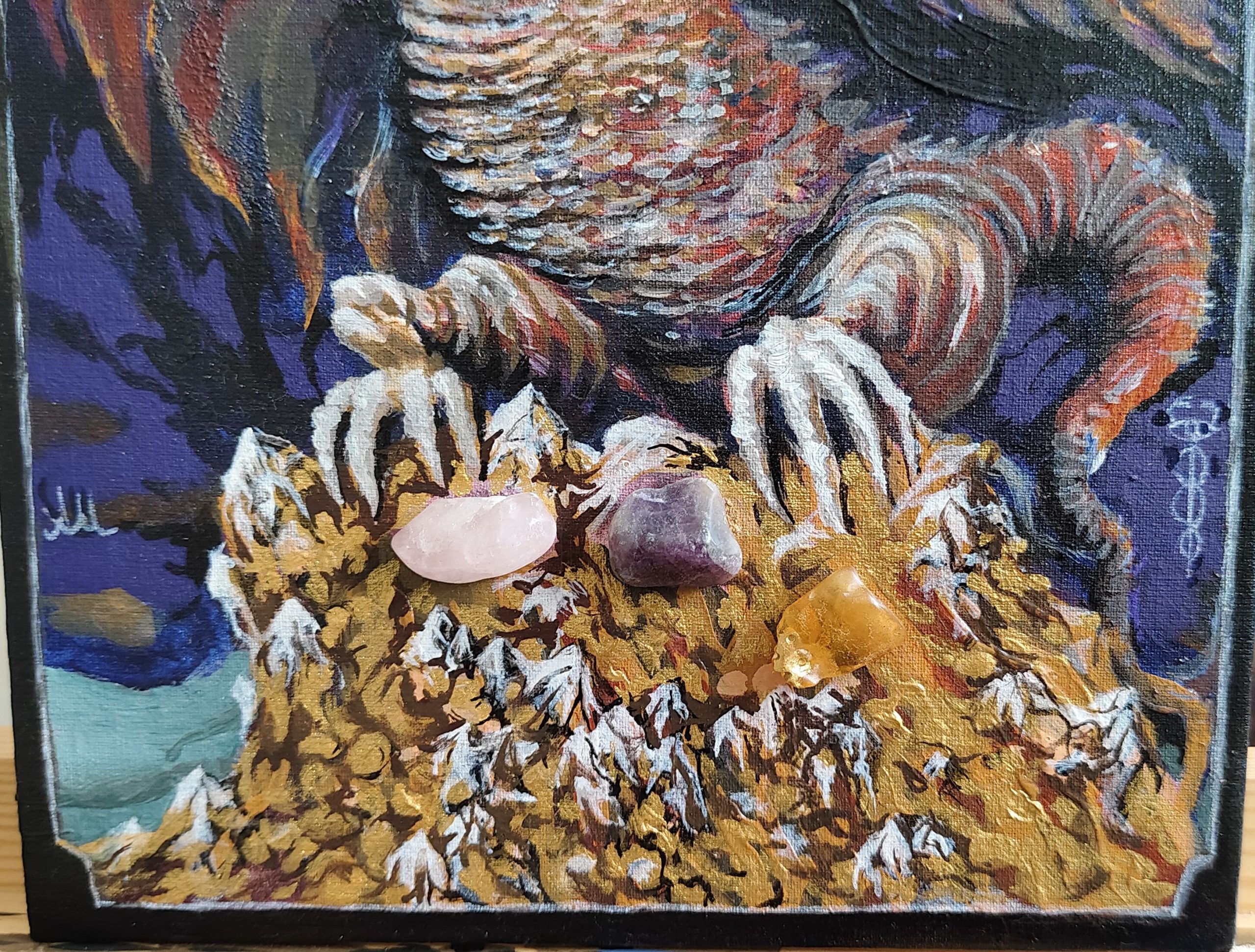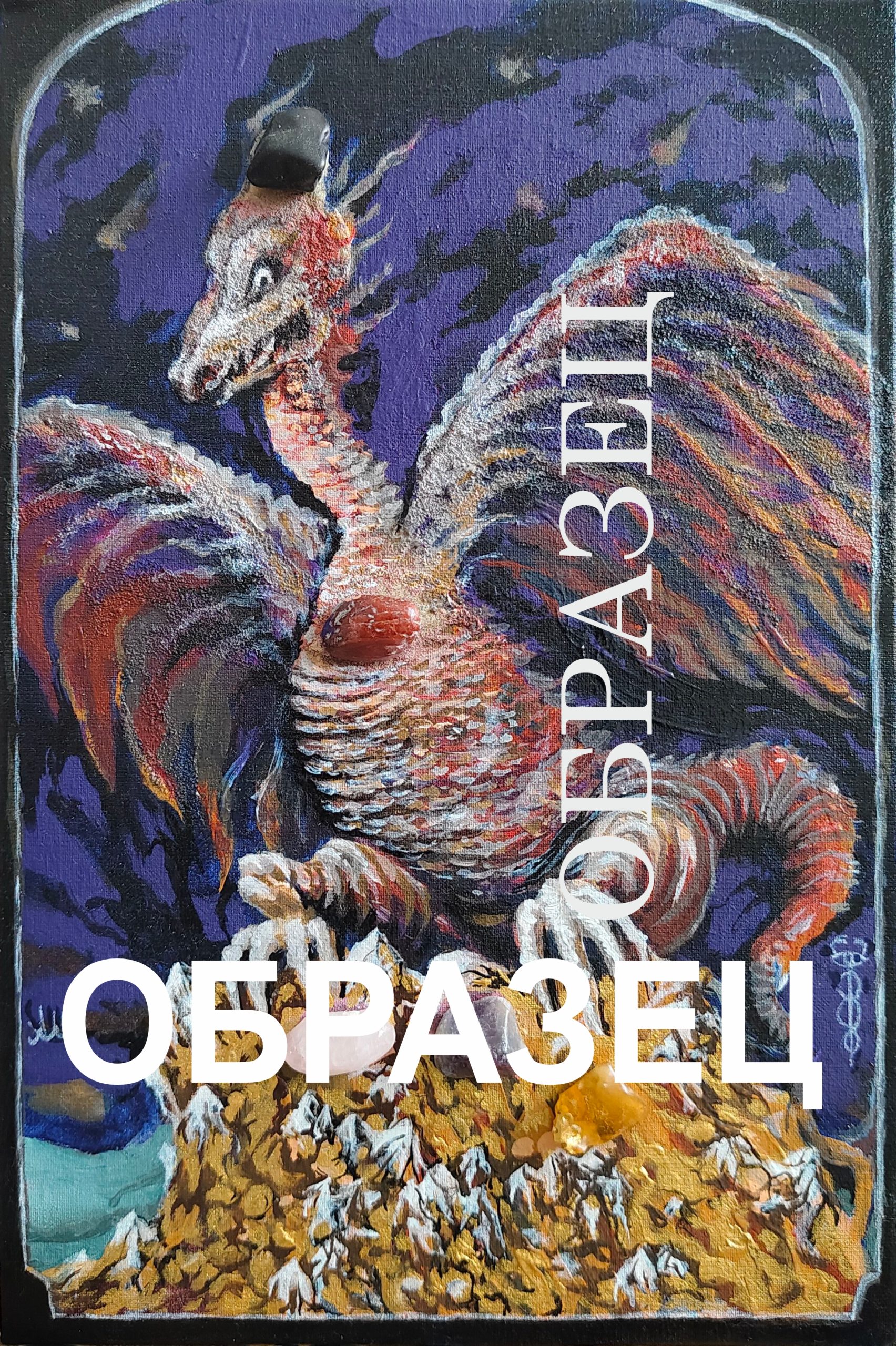 Картина выполнена акриловыми красками на холсте с добавлением каменной пасты. Для усиления настройки были использованы натуральный янтарь, розовый кварц, фиолетовый агат, яшма и обсидиан.