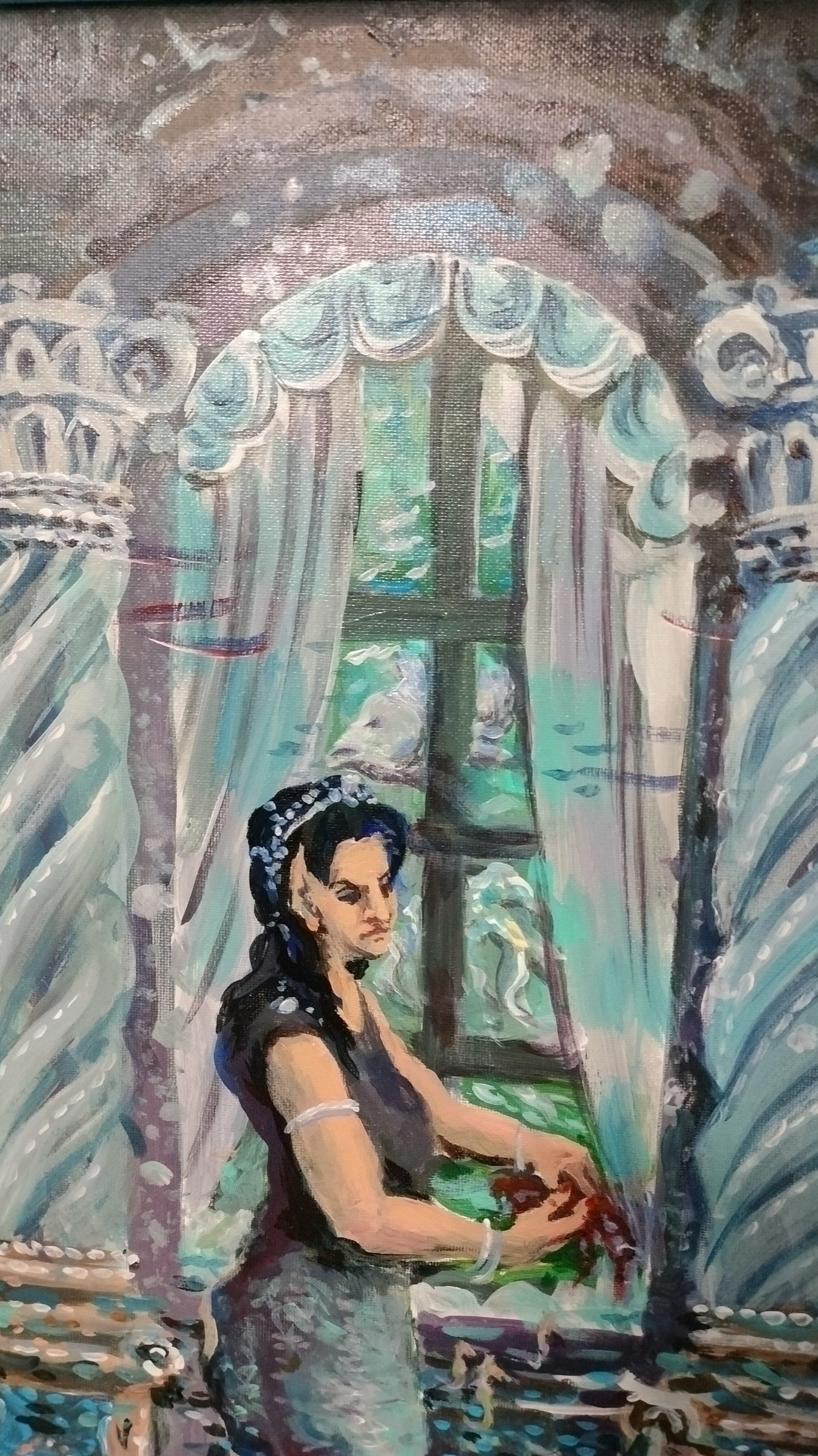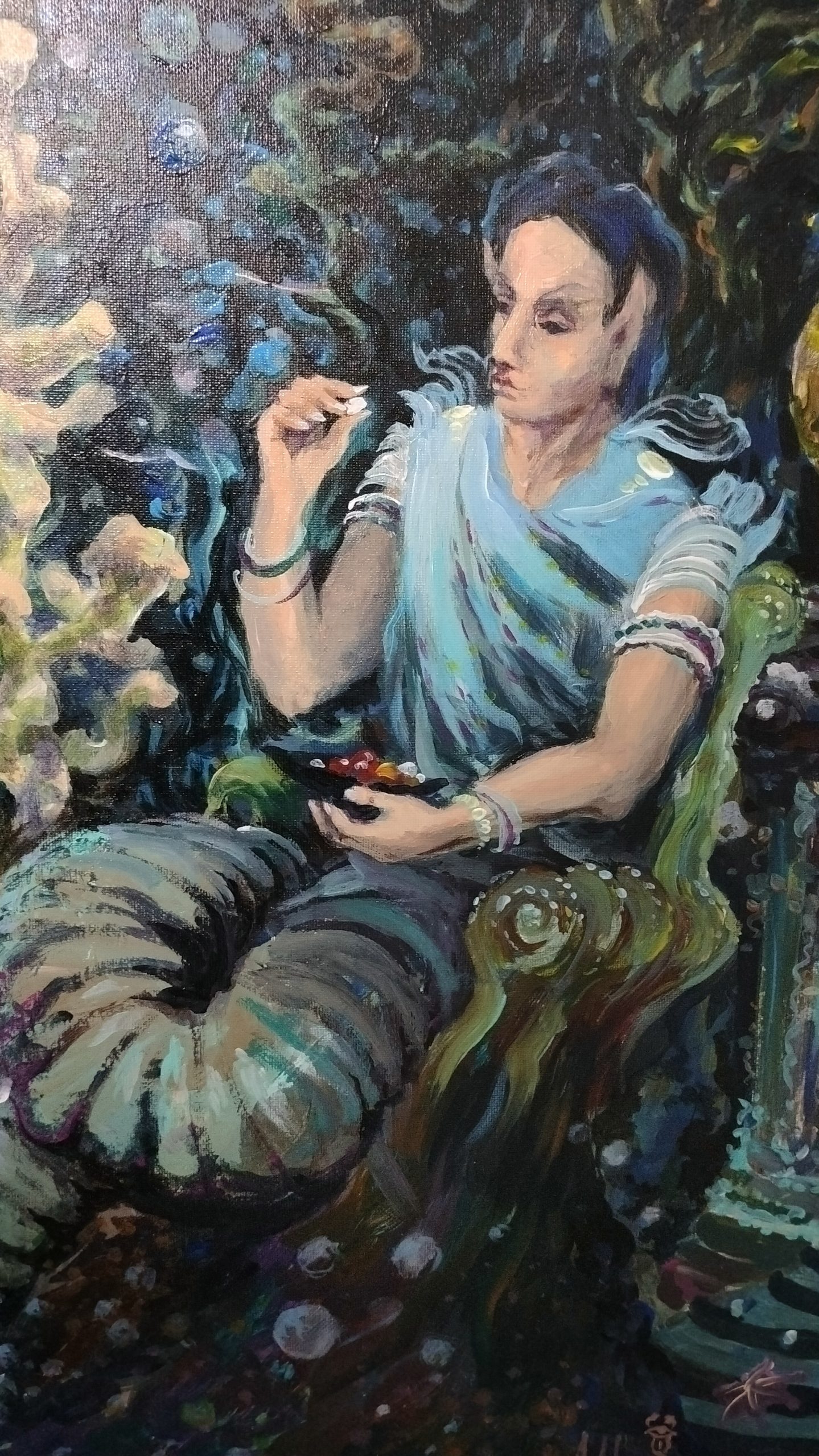 Также на картине изображена сервисный гид альв со специализацией чародейства. Её имя – Эльмира. В руках она держит морскую губку, из которой добывает вещества, необходимые для укрепления кожи.