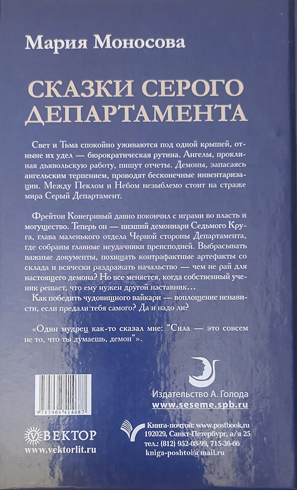 Свет и Тьма спокойно уживаются под одной крышей, отныне их удел – бюрократическая рутина. Ангелы, проклиная дьявольскую работу, пишут отчеты. Демоны, запасаясь ангельским терпением, проводят бесконечные инвентаризации. Между Пеклом и Небом незыблемо стоит на страже мира Серый Департамент.